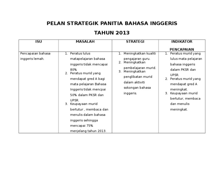 PERANCANGAN STRATEGIK PANITIA BAHASA INGGERIS ISU STRATEGIK. View flipping ebook version of PERANCANGAN STRATEGIK PANITIA BAHASA INGGERIS 2018-2021 published by nurietta70 on 2020-07-02. Bahasa inggeris merupakan subjek yang sukar bagi pelajar.